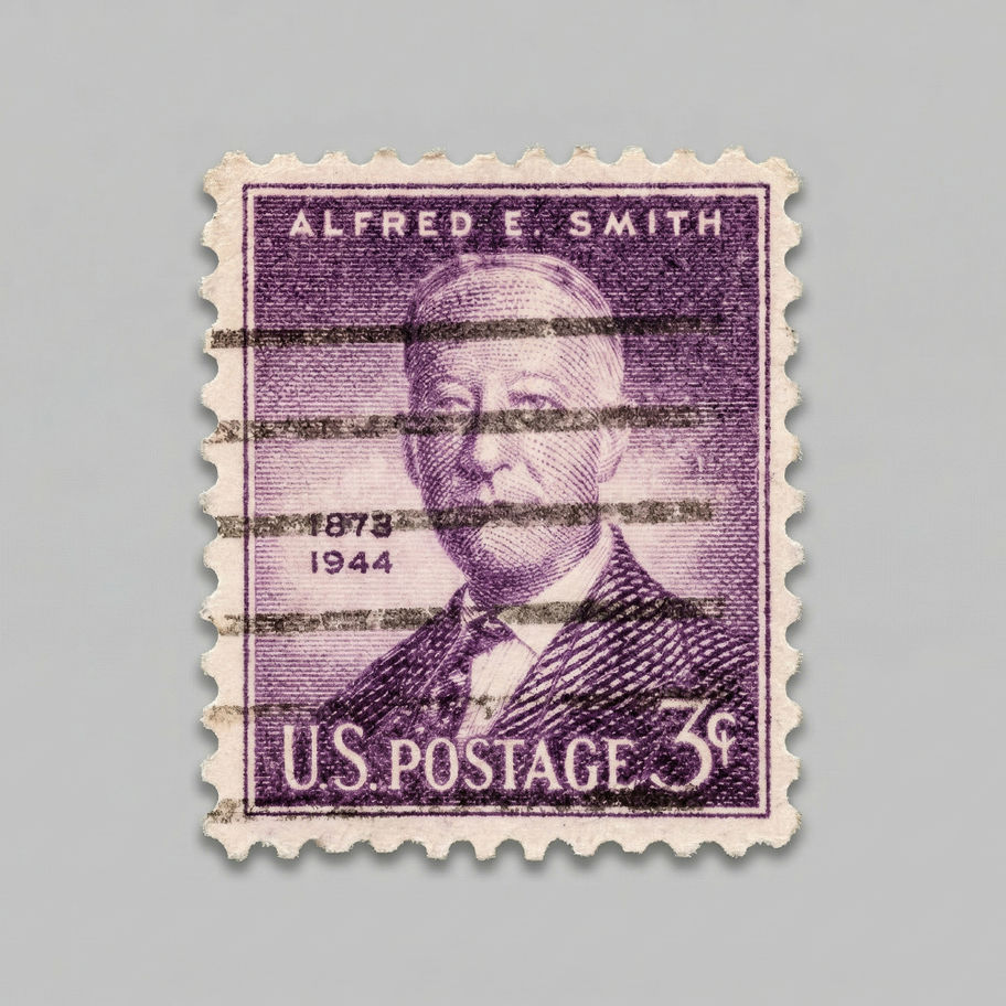 This stamp was issued to commemorate Alfred E. Smith (1873–1944), the influential four-time Governor of New York and the first Roman Catholic presidential candidate from a major party. The postage stamp was released on November 26, 1945, marking the first anniversary of his passing. The design features a portrait of Smith flanked by the years of his birth and death.